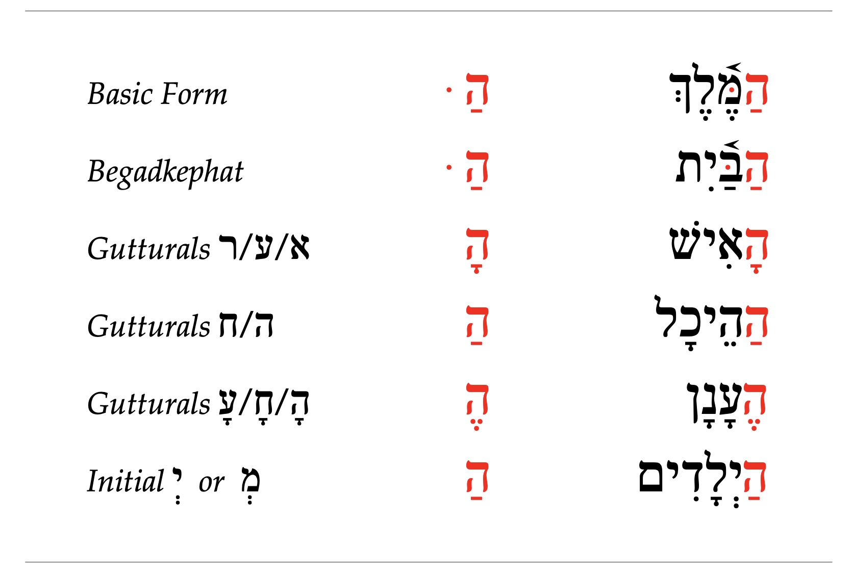 Het lidwoord wordt vastgeschreven aan het woord waar het bijhoort. De eerste letter van dat woord wordt, indien mogelijk, verdubbeld (keelletters en resh worden niet verdubbeld). In deze gevallen kan (hoeft niet) de klinker (patach) verlengd worden. Zie onderstaand overzicht in Figuur 1.