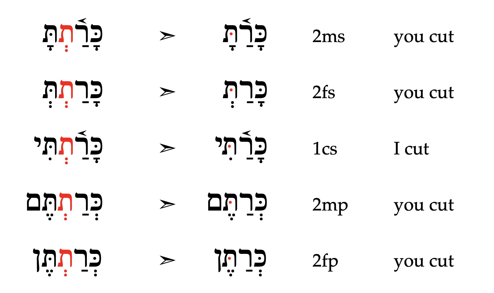 Als een werkwoord waarvan de laatste stamletter een ת is een suffix krijgt dat met een ת begint, dan worden de twee opeenvolgende ת’s vervangen door een ת met een dagesh forte (תּ).Dit betreft vijf vormen van het perfectum. Zie het voorbeeld in Figuur 2.